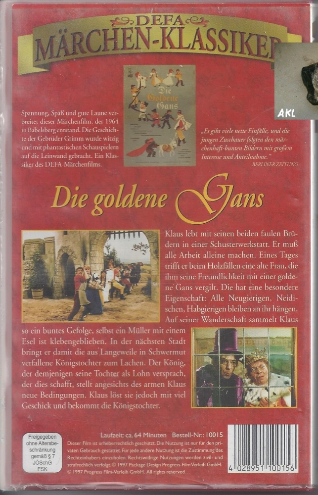In diesem tollen Märchenfilm geht es um den gutherzigen Dummling und seine wundersame goldene Gans. Wer das Tier berührt, bleibt sofort an ihm kleben – und so entsteht bald eine lange, lustige Schlange aus Menschen, die dem Jungen unfreiwillig folgen müssen. Da es sich um eine gebrauchte Videokassette für Kinder handelt, können typische Spuren vom Benutzen wie Beklebungen oder Malereien an der Hülle sowie kleine Fehler bei Bild und Ton vorhanden sein. Ein zeitloser Filmspaß für alle, die klassische Märchen und alte Videos lieben.