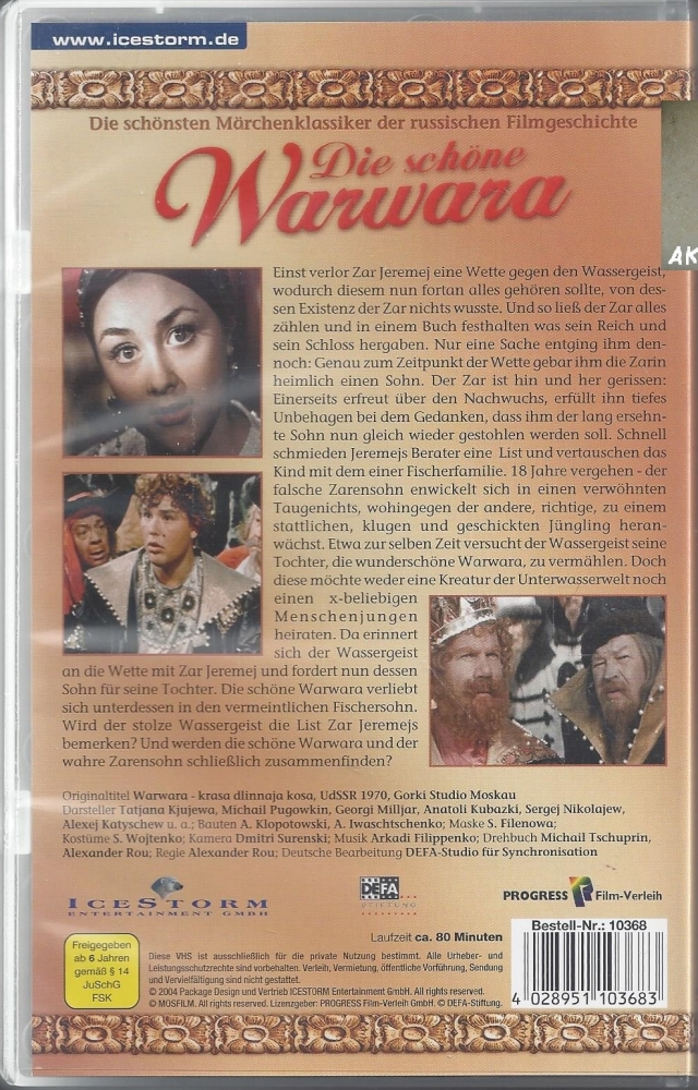Die VHS Die schöne Warwara enthält eine filmische Adaption des russischen Märchens über die schöne Warwara und verbindet klassische Motive mit einer familienfreundlichen Erzählweise. Die Produktion richtet sich an Zuschauerinnen und Zuschauer, die traditionelle Märchenverfilmungen und osteuropäische Filmklassiker schätzen. Die Kassette eignet sich besonders für Sammler älterer Medienformate und Liebhaber nostalgischer Märchenfilme.