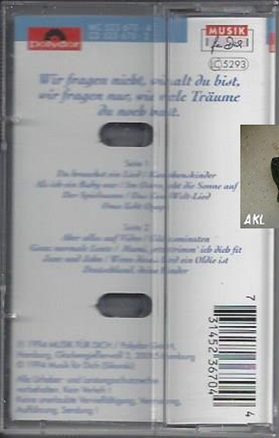 Mit dieser Musikkassette liefert Rolf Zuckowski den perfekten Soundtrack für gute Laune und gemeinsames Singen im Familienkreis. Die abwechslungsreichen Melodien aus dem Hause Musik für Dich sprühen vor Lebensfreude und greifen Alltagsgeschichten auf, die Kinder im Kindergarten- und Grundschulalter begeistern. Der Lieferumfang umfasst ein Stück dieses analogen Tonträgers, der in keiner Sammlung klassischer Kinderlieder fehlen sollte. Da es sich um ein gebrauchtes Kindermedium handelt, können zeittypische Kindermängel, Lagerspuren oder kleine Markierungen an der Kunststoffhülle sowie am Einleger vorhanden sein. Ein echtes Stück Musikgeschichte, das zum Mitmachen und Träumen einlädt.