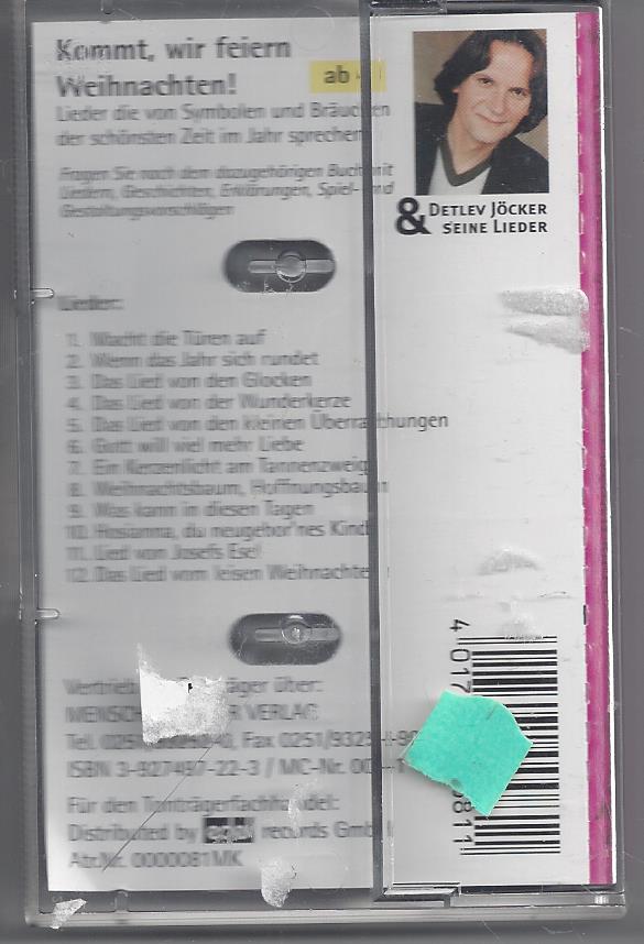 Diese Musikkassette präsentiert eine Auswahl der bekanntesten Advents- und Weihnachtslieder von Detlev Jöcker für die ganze Familie. Die stimmungsvollen Melodien laden Kinder im Kindergarten- und Grundschulalter zum Mitsingen und zur Vorbereitung auf das Fest ein. Die Produktion aus dem Hause Menschenkinder bietet eine kindgerechte musikalische Begleitung für die besinnliche Zeit des Jahres. Der Lieferumfang umfasst ein Stück dieses analogen Tonträgers in einer Standard-Hülle. Da es sich um ein gebrauchtes Kindermedium handelt, können zeittypische Kindermängel, Lagerspuren oder kleine Markierungen an der Kunststoffhülle sowie am Einleger vorhanden sein.