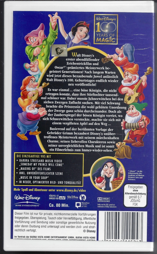 Dieser weltberühmte Zeichentrickfilm aus dem Hause Walt Disney präsentiert die märchenhafte Geschichte nach den Gebrüdern Grimm. Die Produktion gilt als Meilenstein der Filmgeschichte und begeistert seit Generationen durch ihre handgezeichneten Animationen und die unvergessliche Musik. Da es sich um ein gebrauchtes Medium handelt, wurde die ursprüngliche Plastikhülle ersetzt und das Cover ist am Rand beschnitten. Entsprechende Abnutzungserscheinungen an der Kassette sowie dem Gehäuse sind bei diesem Sammlerstück vorhanden. Der Film ist für Kinder im Kindergartenalter sowie für Liebhaber historischer Videoformate gleichermaßen geeignet.